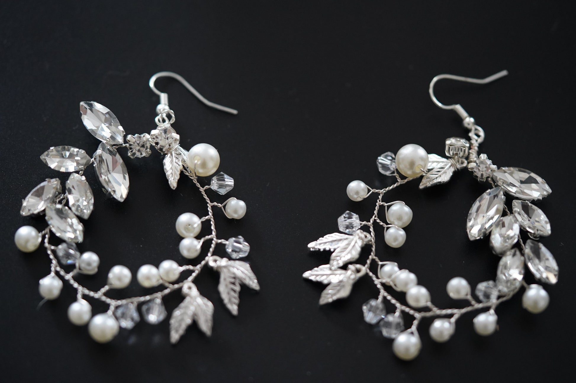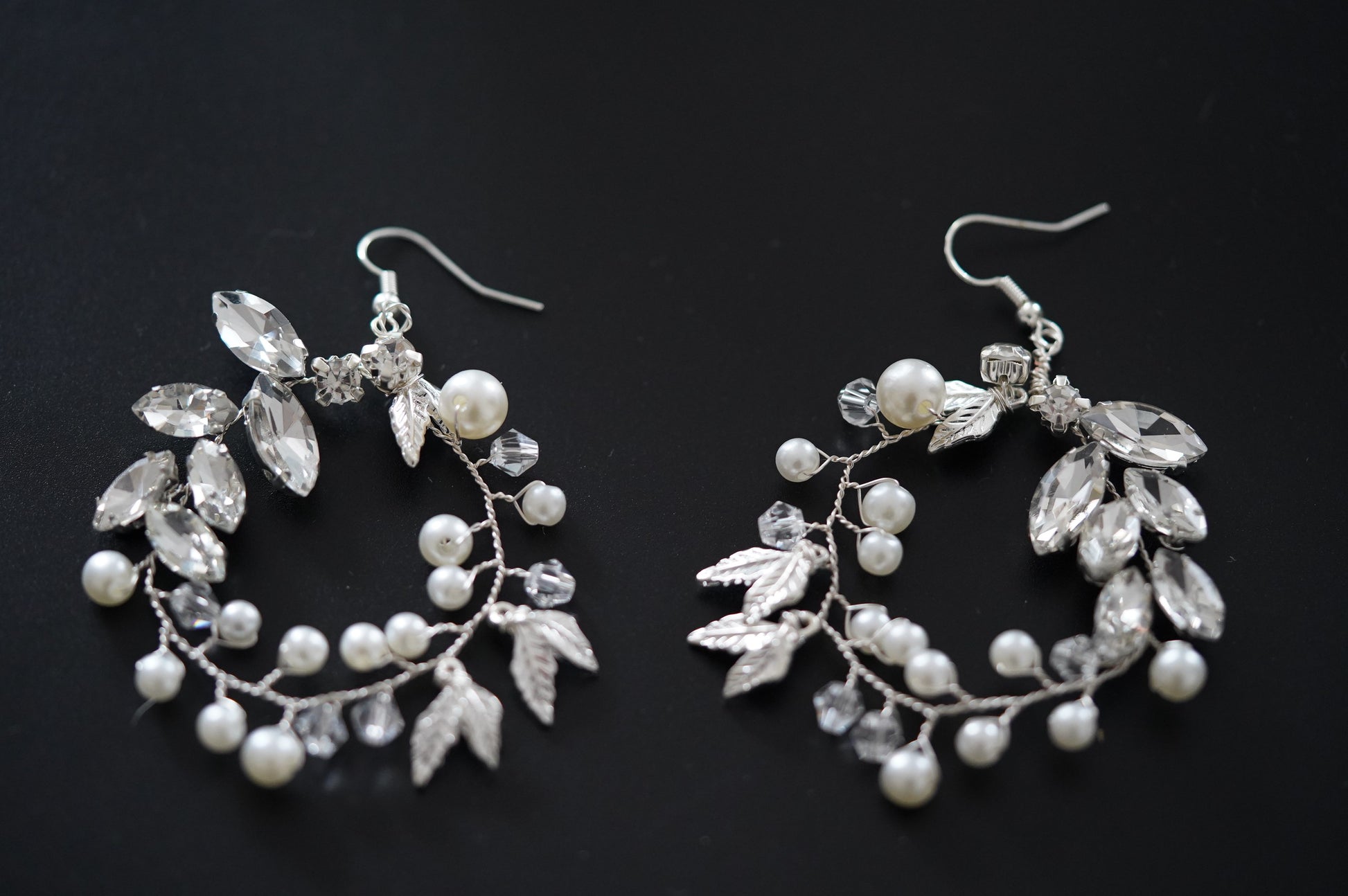Braut Hochzeits Ohrringe 5 cm Durchmesser besetzt mit Perlen Blättchen und Zirkonias