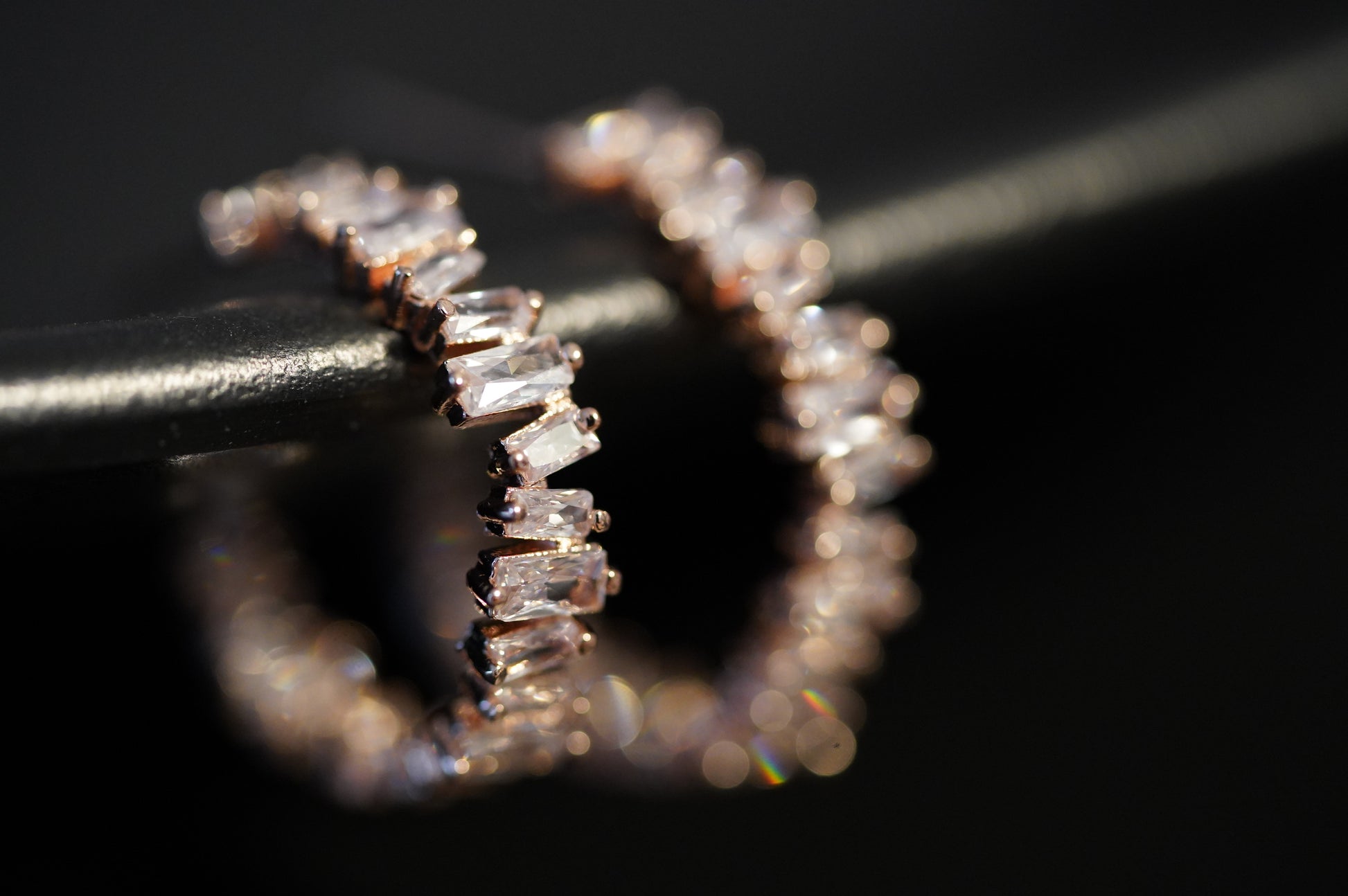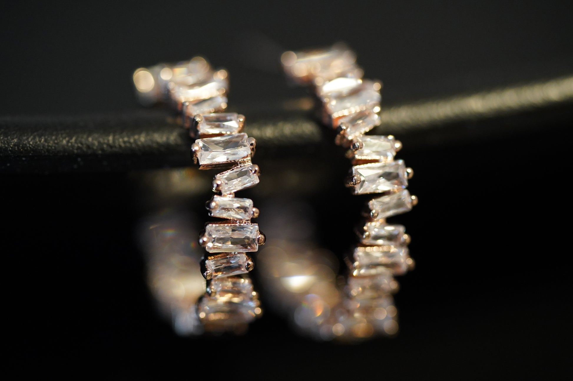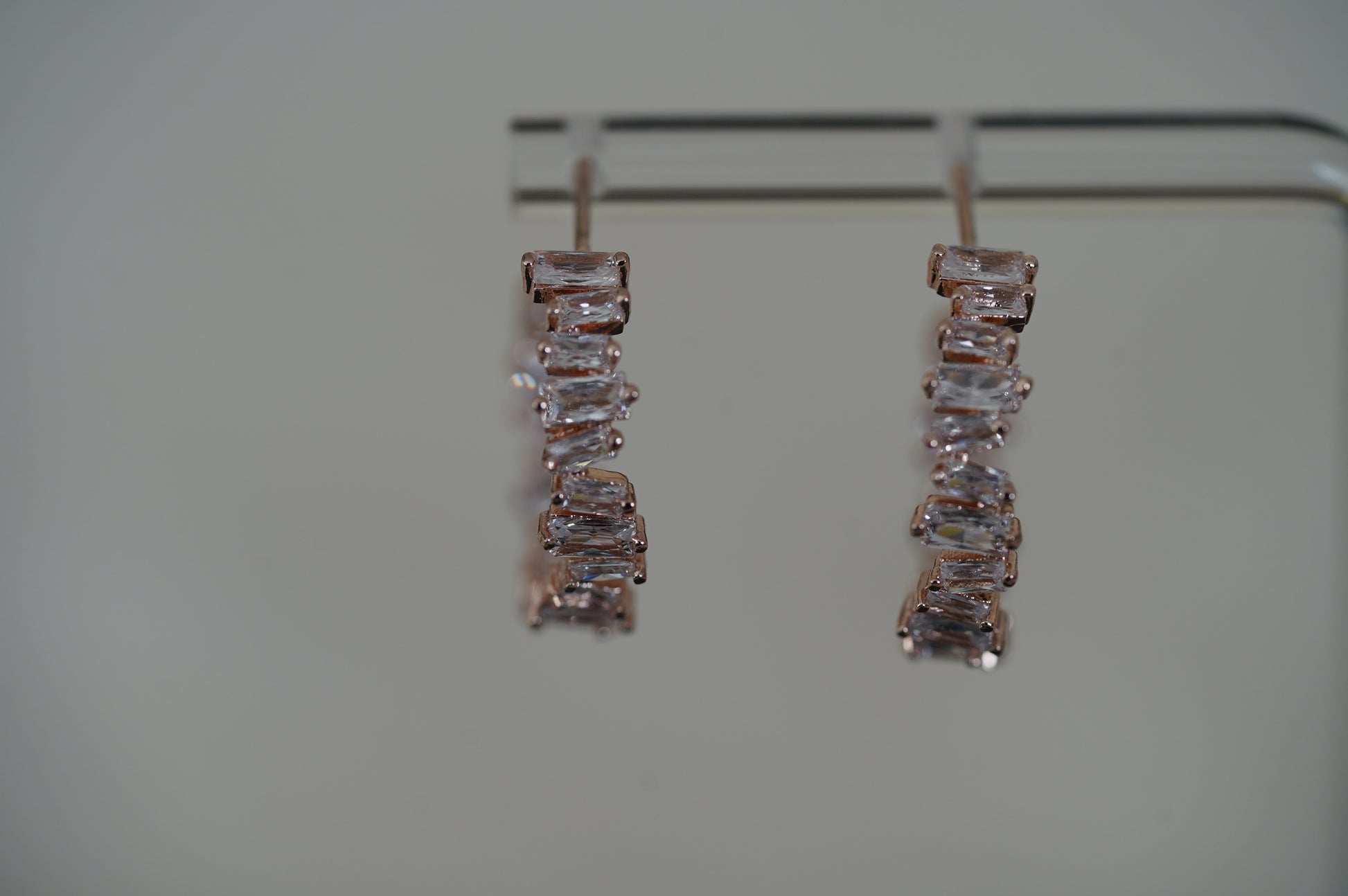 diese feinen rosegoldfarbenen Halbcreolen bilden einen perfekten Halbkreis. Die Zirkonias sind im Baguetteschliff und Fassung eingepassunt. Sie schimmern sehr schön im Gegenlicht und sind ein sehr schöner Hingucker.