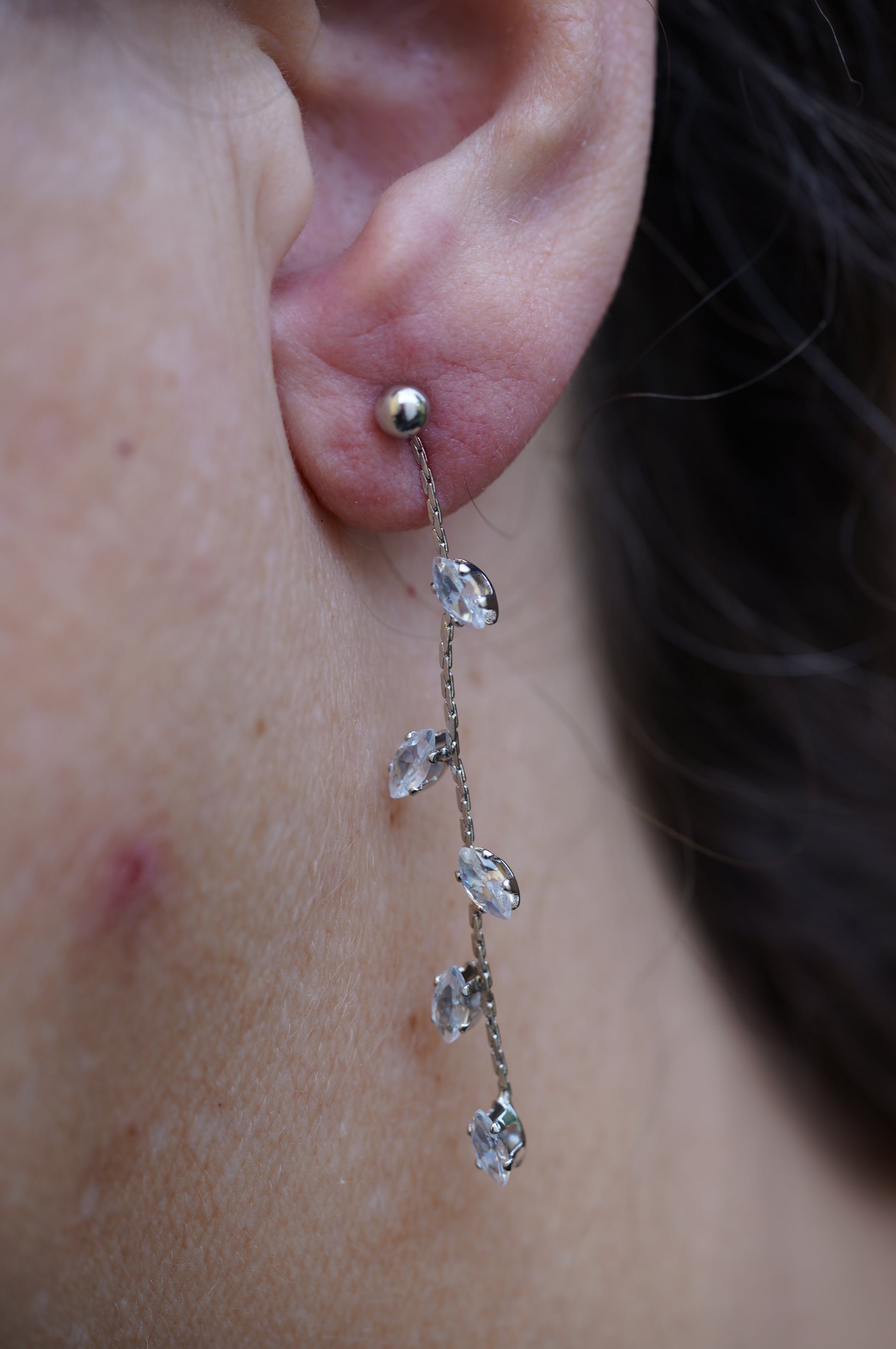 diese extra langen silber 925 Ohrringe haben eine Länge von ca 5 cm. sie sind sehr feingliedrig und haben in regelmäsigen Abständen Zikonias. Das Ganze wirkt wie Zweig Ohrringe . Vom Erscheinumgsbild sind sie sehr feingliedrg.
